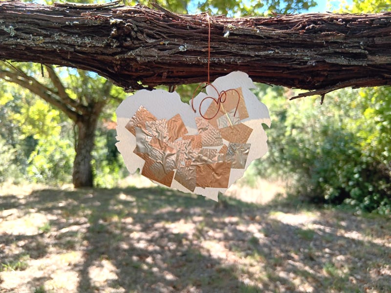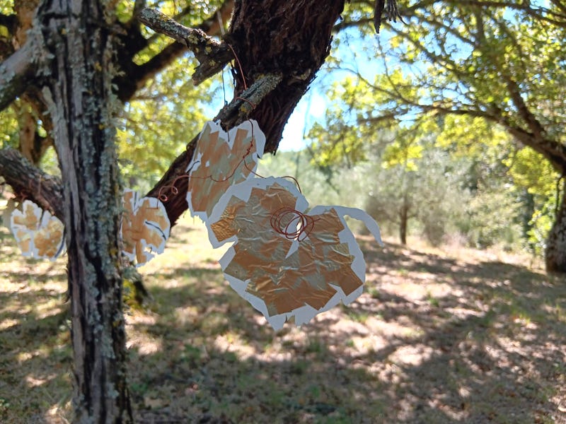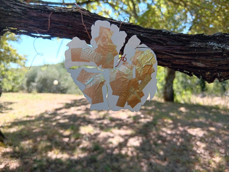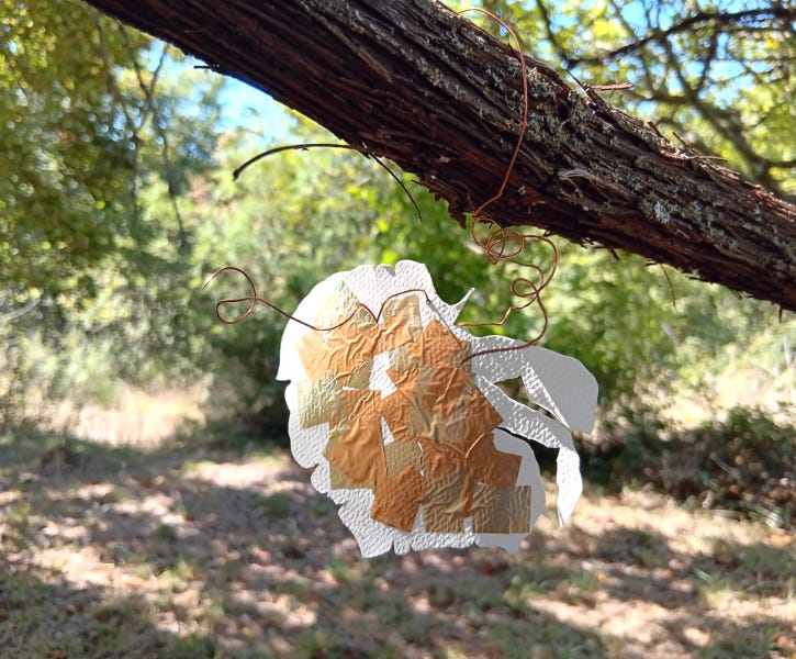 In this installation, I attached paper grape leaves gilded with false gold to a vine with copper wire, to honor last year’s lost crop. 2023 was a particularly difficult year for grapes in Tuscany and Umbria due to unusual rainfall during the month of June. The harsh effect of this atypical weather was felt on vineyards in these regions.